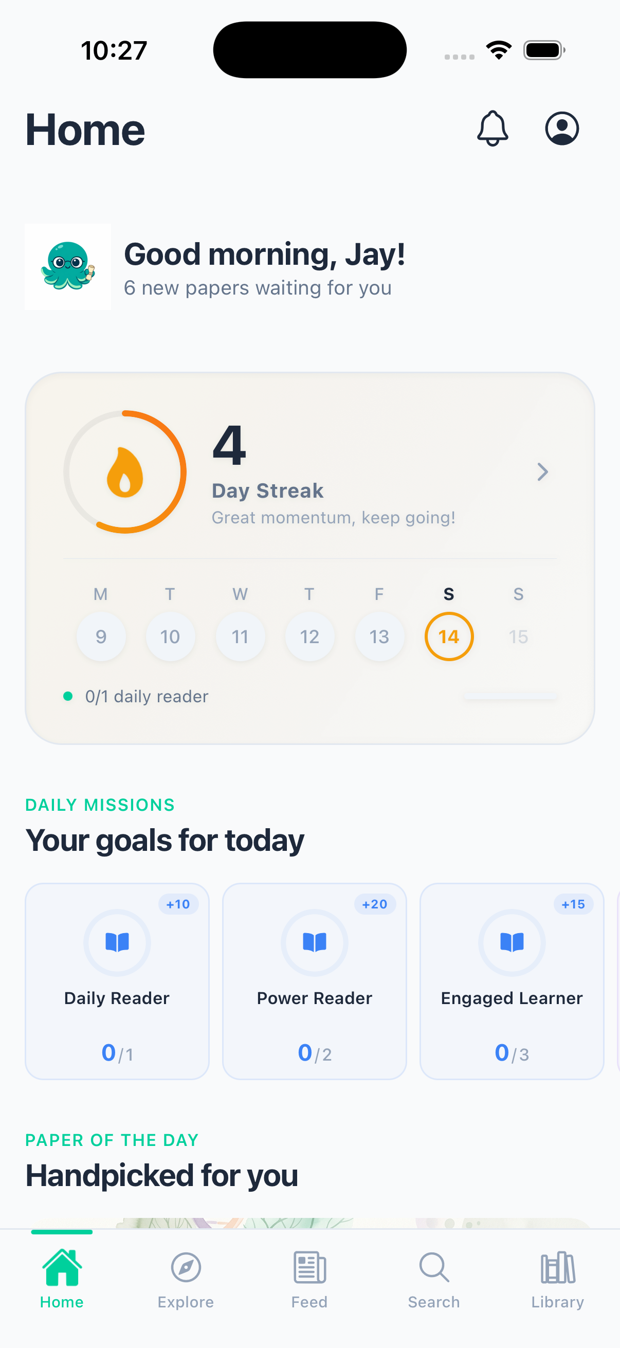 Your daily research home. Track streaks, hit reading goals, and see papers picked for you.